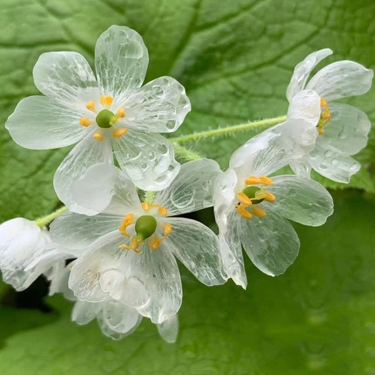 La Diphylleia grayi, también conocida como “flor esqueleto”, es una planta fascinante cuya característica más distintiva es que sus pétalos se vuelven transparentes al contacto con el agua, revelando una estructura casi cristalina. Aunque no es una materia prima tradicional en perfumería —pues no se utiliza como ingrediente aromático— su relevancia radica en su poder simbólico y estético: representa ligereza, pureza y transformación, conceptos que perfumistas y casas creativas emplean como inspiración visual o narrativa para evocar sensaciones etéreas, acuáticas o de fragilidad luminosa en sus composiciones.