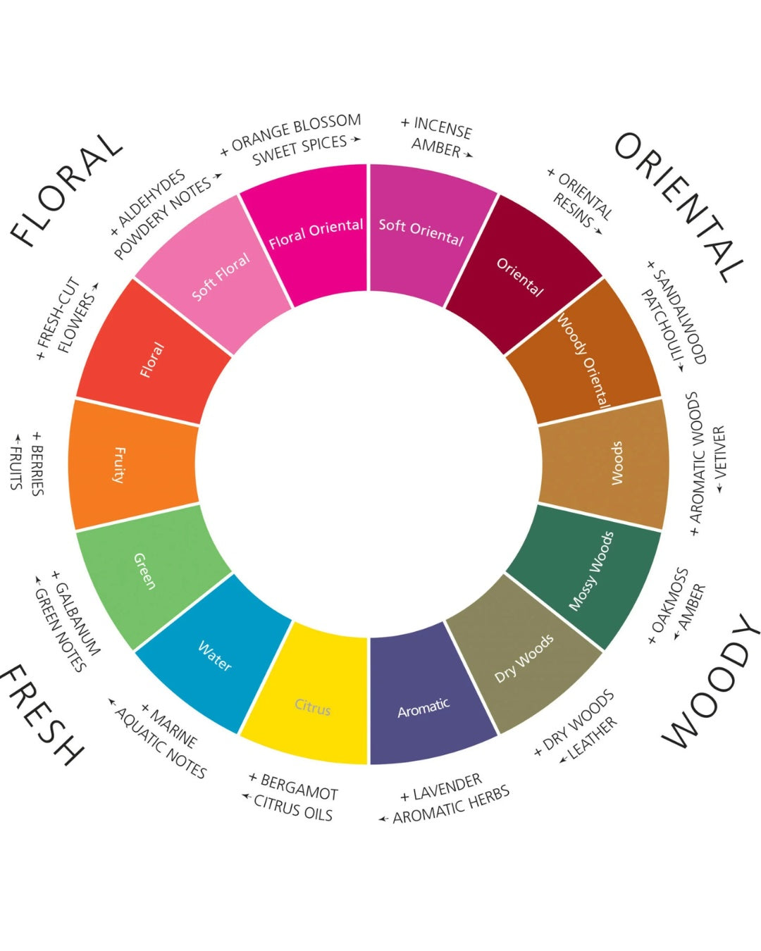 Cada una de estas puede tener subfamilias (floral aldehídica, oriental especiada, cítrica aromática, etc) que afinan aún más su clasificación: