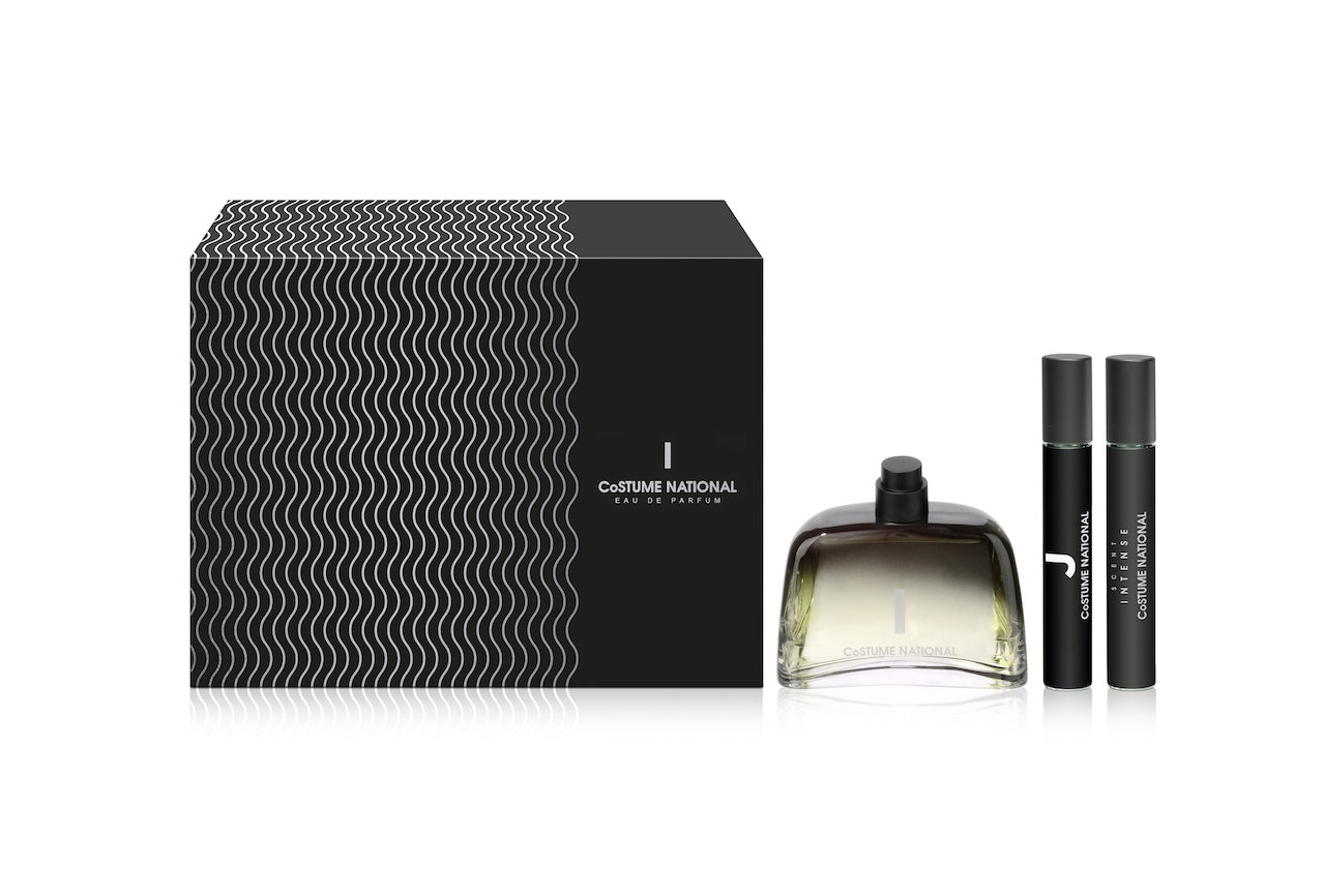 El set se presenta en una elegante caja negra premium reutilizable, complementada con un estuche brillante decorado con un estampado minimalista, al más puro estilo de Costume National Scents.